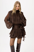 Игривое платье собрано по линии талии на резинку, на подкладке. Подкладка выполнена из отделочной ткани. Платье состоит из 2-х юбок: верхней и нижней. Верхняя юбка из основной ткани представлена двумя воланами на лёгкой сборке. Нижняя юбка-полусолнце - из отделочной ткани, выступает из-под основной. Вырез горловины круглый, по спинке - застёжка-капелька. Рукав втачной одношовный "фонарик".  Нижний край рукавов оформлен манжетами с завязками.