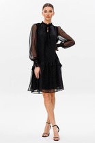 Платье состоит из двух платьев: нижнего и верхнего. Верхнее платье макси прямого свободного силуэта с воланом по низу изделия. Рукав втачной. Горловина обработана плосколежащим воротником. Центральная застёжка на петли и пуговицы. Нижнее платье комбинация на регулируемых бретелях.
