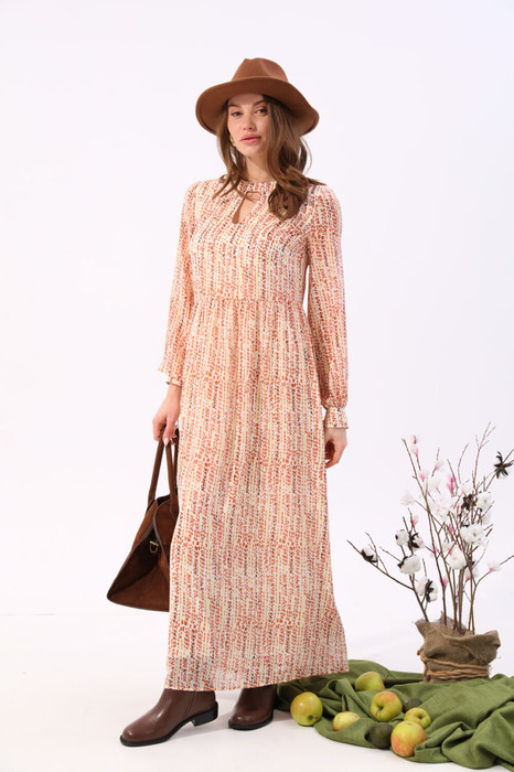 Платье макси прямого силуэта с V-образным вырезом, отрезное по линии талии. Горловине с имитацией чокера. По спинке разрез-капелька с завязками. Рукав немного приспущен, нижний край рукавов оформлен манжетами с завязками. Изделие на подкладке.