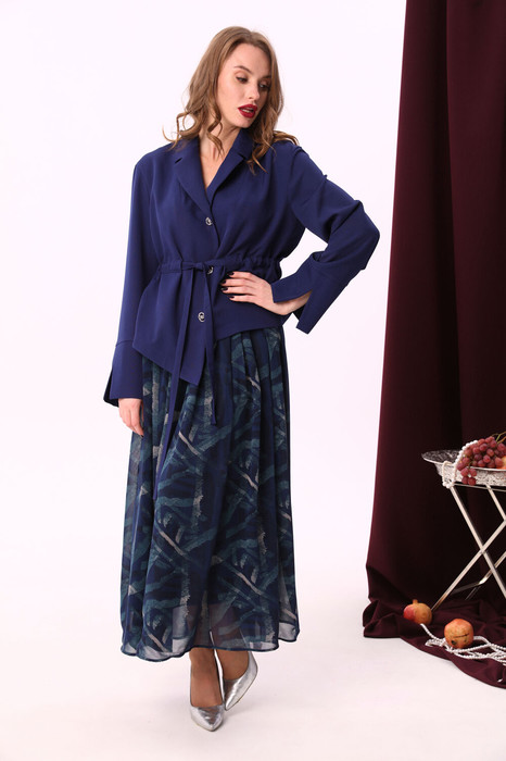 Платье комбинированное из двух тканей. Нижняя часть платья прямого силуэта, длинная , со сборкой по линии талии из отделочной ткани. Юбка на подкладке. Верхняя часть платья из основной ткани, частично на подкладке. Прямой силуэт, воротник пиджачного типа, рукав одношовный, втачной , с незначительно спущенной линией плеча, длинный, с притачной манжетой, декорированной разрезом. По линии ткани настрочная кулиса с завязками из основной ткани. Застежка центрально-бортовая на одну петлю и пуговицу функциональную и две пуговицы- имитация. Линия низа верхней части фигурная ассиметричная.