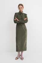 Платье комбинированное из двух тканей. Нижняя часть платья прямого силуэта, длинная , со сборкой по линии талии из отделочной ткани. Юбка на подкладке. Верхняя часть платья из основной ткани, частично на подкладке. Прямой силуэт, воротник пиджачного типа, рукав одношовный, втачной , с незначительно спущенной линией плеча, длинный, с притачной манжетой, декорированной разрезом. По линии ткани настрочная кулиса с завязками из основной ткани. Застежка центрально-бортовая на одну петлю и пуговицу функциональную и две пуговицы- имитация. Линия низа верхней части фигурная ассиметричная.