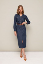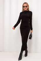 Платье комбинированное, состоящее из двух частей: верхней и нижней. Нижняя часть: платье А-силуэта свободного прямого кроя с втачным рукавом. По окату рукава сборка, по низу манжет. По спинке шов. Горловина полукруглая, застегивается на пуговицу по спинке.Верхняя часть - имитация удлиненного жилета прямого кроя. В комплект к платью идёт ремень из экокожи, может отличаться от заявленного на фото.