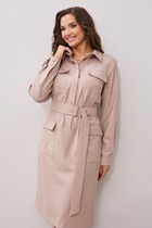 Платье приталенного силуэта, отрезное по линии талии. Верхняя часть переда с нагрудной вытачкой из бокового шва. Застёжка на два ряда петель и пуговиц, со сборкой по нижнему срезу. Верхняя часть спинки с плечевой вытачкой и со сборкой по нижнему срезу. Верхние срезы нижних частей переда и спинки присборены. Верхняя и нижняя части изделия соединены между собой притачным поясом.