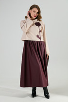 Платье состоит из двух платьев: верхнего и нижнего. Верхнее платье свободного кроя длиной макси с цельнокроеным рукавом и подрезом по линии талии. Перед со средним швом, переходящим в V-образный вырез горловину и разрез от середины бедра.  В верхней части переда выполнены рельефные швы до уровня подреза. Объем по линии талии регулируется завязками, закрепленными в рельефных швах переда.Средняя часть переда переходит в стойку. По низу рукавов складки и манжеты с завязками. Низ и разрез обработаны широкой подгибкой с закрытым срезом. Нижнее платье комбинация на регулируемых бретелях.