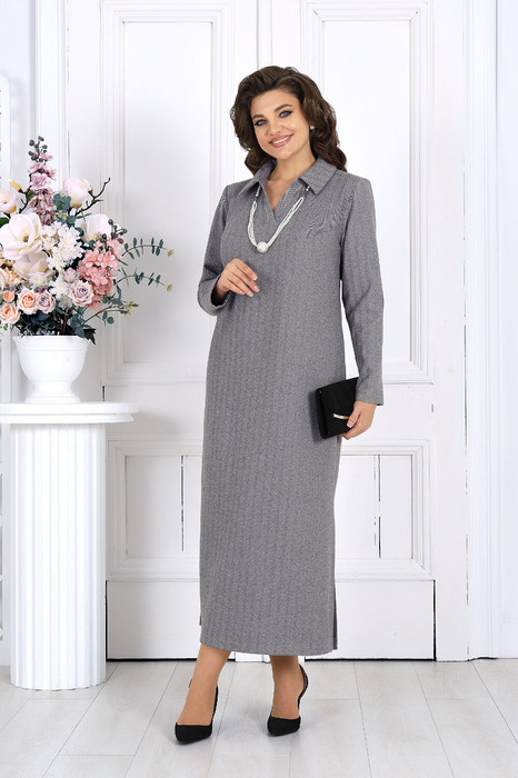 Платье женское, прямого силуэта, расширенное к низу, выполнено из трикотажного полотна. Платье женское прямого силуэта, длиной по среднему шву спинки 124 см, от шва втачивания воротника. Перед платья с нагрудными вытачками из проймы. Спинка со средним швом. В боковых швах обработаны карманы и разрезы. Воротник рубашечного типа, по переду планка «поло». Рукав втачной, одношовный, длиной 60 см. Платье без подкладки.