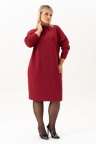 Платье женское полуприлегающего силуэта, выполнено из трикотажного полотна с фактурной лицевой стороной «люрекс». Модель с карманами в боковых швах, на трикотажной подкладке, с плечевыми накладками. Перед с нагрудными вытачками, направленными от пройм. В верхней части среднего шва спинки расположена застежка на тесьму-«молнию» (50 см), в нижней - разрез. Круглая горловина оформлена съемным воротником, декорированным спереди пришивными камнями. Рукав длинный, втачной, низ оформлен съемной манжетой с разрезом. Воротник и манжеты выполнены из сатина и пристегиваются к изделию при помощи прорезных петель и пуговиц.