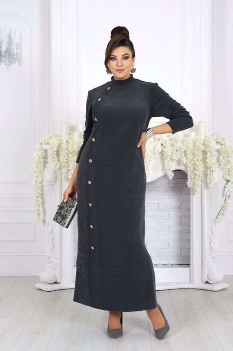 Платье женское полуприлегающего силуэта, выполнено из фактурного трикотажного полотна с рубчиком. Модель без подкладки, без застежки и плечевых накладок. В левом боковом шве обработана шлица с застежкой на 5 петель и 5 декоративных пуговиц.  Перед платья асимметричный: с нагрудной вытачкой на левой части переда и планкой с декоративными пуговицами на правой; планка выполнена из гладкого отделочного трикотажного полотна. Спинка с талиевыми вытачками. Круглая горловина оформлена невысокой стойкой. Рукав втачной, длинный.