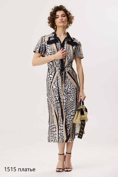 Стильное женское платье с дизайнерским принтом. Модель полуприлегающего силуэта с втачными рукавами и рубашечным воротником. Перед с застёжкой на петли и пуговицы по планке. Линия талии платья декорирована кулиской. В боковых швах разрезы.