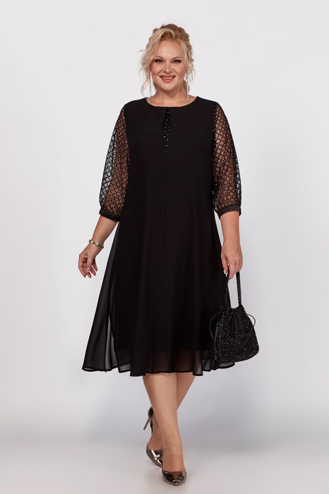 Эффектное шифоновое женское платье А–силуэта. Подкладка изделия выполнена из ткани " масло". Этот праздничный, но в то же время элегантный наряд из воздушной ткани украшен рукавами из сетки с блестящим напылением в виде страз и способен подчеркнуть индивидуальность и благородство своей обладательницы. На полочке по среднему шву обработана имитация капельки со вставкой из сетки. На спинке обработана капелька на навесную петлю и пуговицу. По боковым швам верхнего платья из шифона обработаны высокие разрезы. По низу рукава пришита декоративная резинка. Такое замечательное нарядное черное платье способно стать незаменимым элементом в гардеробе современной модницы. Силуэт платья прекрасно скрывает нюансы фигуры и подчеркивает достоинства. Это платье будет уместно на свадьбе подруги, дне рождения, корпоративе и вечеринке, а также на фотосессии, школьном выпускном балу, вечерней прогулке с друзьями, для домашнего романтичного ужина или свидания.