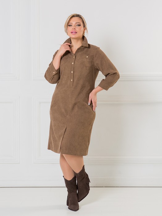Удобное повседневное платье, полуприлегающего силуэта, выполнено из эластичного вельвета. Платье по переду с притачными кокетками, средним швом и шлицей длиной 22 см. В верхней части переда, по среднему шву, втачная планка с застежкой на петли и пуговицы. Платье с двумя накладными нагрудными карманами и удобными прорезными карманами с листочкой. Спинка со средним швом и двумя вертикальными вытачками. Горловина переда и спинки с втачным отложным воротником на цельнокроеной стойке. Рукав втачной свободный длиной 3/4 с притачными манжетами по низу. Манжеты застегиваются на петли и пуговицы. Длина рукава от плеча в 50 р-ре – 45 см. в 64 р-ре – 50 см., ширина рукава по низу в 50 р-ре – 27 см. в 64 р-ре – 33 см. Платье без подклада. Длина изделия по спинке в 50 р-ре – 102 см. в 64 р-ре – 110 см.