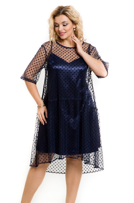 Нарядное платье свободного силуэта выполнено из сетки с бархатным напылением. Перед и спинка платья целые. Платье с ассиметричным фигурным отрезным низом с небольшой сборкой по шву притачивания. Спинка длиннее переда на 12 см. Овальный вырез горловины переда и спинки обработан настрочной окантовкой. Платье с удлиненной линией плеча, рукав втачной прямой. Длина рукава от горловины в 48 р-ре – 43 см. в 58 р-ре – 45 см., ширина рукава по низу в 48 р-ре – 36 см. в 58 р-ре – 42 см. Платье с подкладом. Подклад выполнен отдельно от платья, из тонкого эластичного атласного полотна. Подклад на бретелях, длина бретелей регулируется. Длина подклада без бретелей в 48 р-ре – 80 см. в 58 р-ре –В В 84 см. Платье без застежек. Длина изделия по спинке в 48 р-ре – 112 см., в 58 р-ре -В В 116 см.