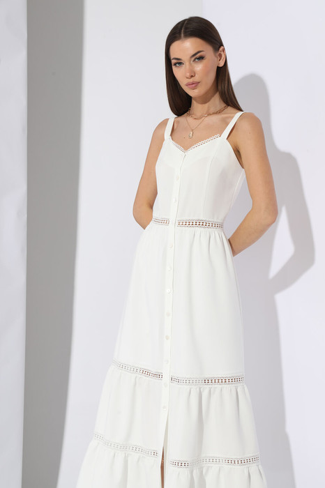 Платье на бретелях. Полуприлегающего силуэта до талии, расширяющееся к низу. Нижняя часть с притачными воланами со сборкой. Застежка – планка на петли и пуговицы. Верхняя часть переда и спинки с вертикальными рельефами. По верхнему, между воланами платье декорировано хлопковым кружевом.