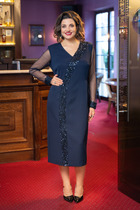 Платье женское полуприлегающего силуэта, втачного покроя, с центрально бортовой застежкой на планку на петли-пуговицы. Платье выполнено из джинсовой плательной ткани. Перед резной состоит из кокетки верхней, верхней центральной, верхней боковой частей, нижней кокетки переда, центральной нижней, боковой нижней частей. На переде так же расположены наклонные карманы, на талии хлястики, идущие от кулисы по спинке. Спинка состоит из кокетки, верхней части спинки, центральной и боковых частей. В центральной части по талии расположена кулиса с резинкой для лучшего прилегания. Рукав двушовный, полной длины, с манжетами по низу. Горловина оформлена стояче отложным воротником с отрезной стойкой. В модели используются отделочные строчки контрастного цвета, пуговицы так же являются отделкой и идут контрастного цвета.