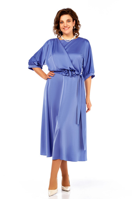 Нарядное платье из струящейся ткани, отрезное по линии талии. Верх летучая мышь, по низу рукава сборка и притачная манжета. Вырез горловины округлой формы. По переду ассиметричная деталь от плеча до линии подреза. По линии подреза резинка. Нижняя часть платья клеш. К платью прилагается интересный пояс, украшенный стразами.