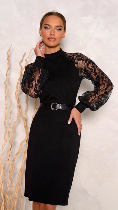 Роскошное черное платье с декорированным ажурным кружевом с блеском.