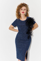 Платье втачного покроя, рукава короткие одношовные, низ оформлен воланом со сборкой. Спинка цельная с настрочным воланом с оборкой по верхнему срезу волана.