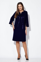 Выполнено из джинсовой ткани (хлопок) плательного ассортимента. Платье с центрально-бортовой застежкой на цельнокроеную планку на петли и пуговицы. Воротник стояче-отложной, с цельнокроеной стойкой. В боковых швах расположены карманы, которые закреплены отделочной строчкой. В области груди на деталях переда расположены накладные карманы, левый карман декорирован печатью. Спинка цельная. К платью прилагается пояс из основной ткани.
