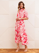 Платье полуприлегающего силуэта, втачного покроя. Выполнено из трикотажного плательного полотна с блеском. Отрезное по линии талии по переду, верхняя часть переда на подкладке. Рукав одношовный короткий. Верхняя часть переда состоит из кокетки и лифа со складками, идущими на «запах» (имитация застежки). Спинка с талиевыми вытачками и средним швом, в котором разрез и застежка на «тесьму-молнию». Платье к низу заужено, горловина «V-образной» формы по переду. Дополнением служит пояс с пряжкой из основной ткани.