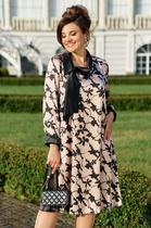 Платье женское полуприлегающего силуэта, с застежкой на петли-пуговицы до волана. По переду фигурный вырез и по два вертикальных рельефа, переходящих во встречные складки. Спинка с талиевыми вытачками, между которыми настрочена резинка. К платью пришиты два волана со сборкой, нижний имеет фигурный низ. Рукав втачной, короткий.