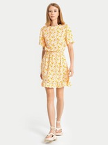 ШтрихКод: 4630328752563 По размеру: 52, 56 Состав: Вискоза 30% Полиэстер 65% Эластан 5% Срок готовности: 2023-05-12T00-00-00Яркое платье полуприлегающего силуэта из текстильной ткани желтого цвета. Круглый вырез изделия обработан декоративным швом с резинкой. Верхняя часть изделия дополнена широким воланом. По линии талии внутренний шов с резинкой. По низу изделия - оборка. Длина изделия по спинке от плечевого шва до низа изделия — 144 см. Рост фотомодели — 170 см.