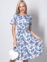 Элегантное платье полуприлегающего силуэта из трикотажного полотна синего цвета. Круглый вырез обработан кантом. Отрезная кокетка и втачные рукава выполнена из декоративного полотна с крупной перфорацией. Аксессуары в комплект не входят.