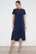 Детали: отрезная линия талии, пояс-кокетка с регулируемой шнуровкой, рукава втачные длинные, платье без застежки