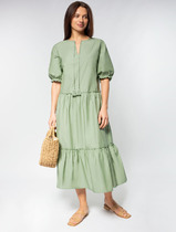 Модель полуприлегающего силуэта, с отрезной линией талии и втачным поясом. На верхней части переда настрочена планка, на нижней - клапаны. Округлый вырез горловины спереди подчёркнут планкой. Средний шов спинки снизу заканчивается разрезом. Платье декорировано пуговицами.