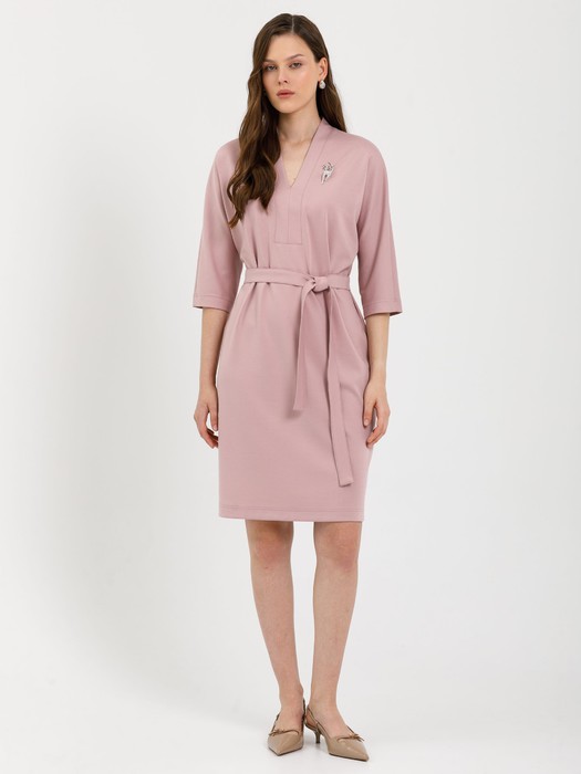 V-образный вырез горловины обработан планкой. Средний шов спинки снизу заканчивается разрезом. Талия подчёркнута съёмным завязывающимся поясом. Платье декорировано брошью.