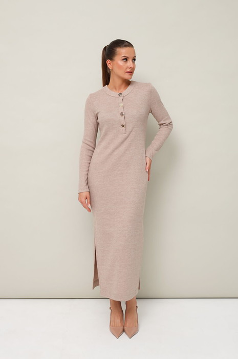 Стильное платье полуприлегающего силуэта, выполнено из трикотажного полотна. Горловина округлой формы, с центральной застежкой на петли и 4 разных пуговицы. Рукава длинные втачные. В боковых швах обработаны высокие разрезы.