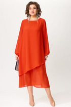 Платье из шифона с абстрактным принтом, отрезное выше линии талии. Горловина округлой формы. Лиф платья с застежкой на притачные планки с петлями и пуговицами. Нижняя часть платья с притачным воланом со сборкой. Рукава длинные втачные на резинке в области запястья. В комплекте прилагается нижнее платье-комбинация на регулируемых бретелях