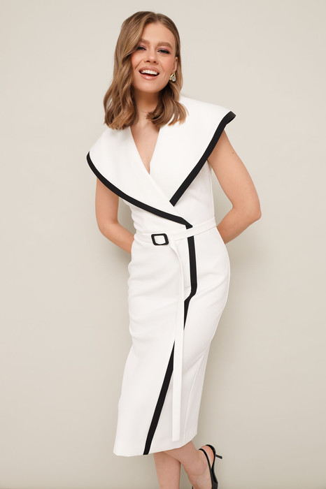 Элегантное платье прилегающего силуэта отрезное по линии талии, выполнено из костюмно-плательной ткани. V-образный вырез горловины с имитацией запаха, с углубленным воротником шалевого типа, прикрывающий руки. По краю воротника и в вертикальном подрезе юбки обработана отделочная деталь контрастного цвета. Спинка со средним швом, переходящим в шлицу.