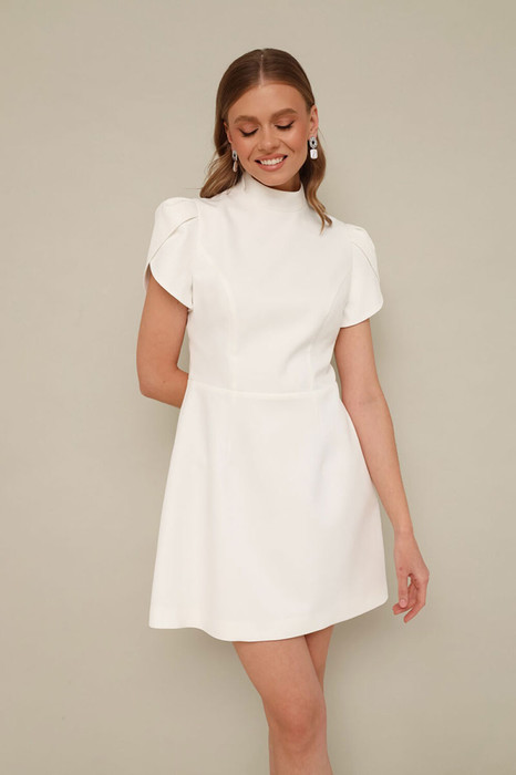 Платье в длине мини, отрезное по линии талии, выполнено из плательной ткани. Горловина с отрезной стойкой. Лиф переда с рельефами. Присборенные рукава-тюльпаны с контрастной отделочной тканью. Юбка А-образного силуэта. В среднем шве спинки застежка по лифу- навесные петли и обтяжные пуговицы, по юбке- потайная молния.