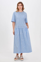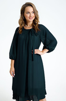 Лаконичное платье прилегающего силуэта, отрезное по талии, выполнено из плательной ткани. Округлый вырез горловины. Лиф по переду и спинке с конструктивными складками в рельефах. Юбка с высоким разрезом по левой стороне. Застежка в среднем шве спинки на потайную молнию. Платье обработано подкладкой.