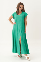 Вечернее платье полуприлегающего силуэта, выполнено из струящейся ткани с благородным матовым блеском. Ассиметричный вырез горловины с открытым плечом. Правый плечевой шов декорирован складками. Платье отрезное по линии талии на резинке. Рукава длиннные с манжетами с застежкой на петли и пуговицы. По спинке в среднем шве юбки обработан разрез.