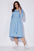 Легкое платье прямого силуэта. Округлая горловина на внутренней обтачке. Короткие цельнокроеные рукава, оканчиваются манжетами на отворотах. В среднем шве спинки расположен разрез с застежкой на пуговицу. Пояс из основного материала в комплекте. Низ ровный, без разрезов.