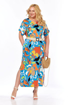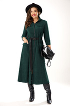 Платье полуприлегающего силуэта, длиной чуть ниже щиколотки. Платье отрезное по линии талии. Лиф спинки с талиевыми вытачками. Юбка спинки с талиевыми вытачками. В среднем шве спинки обработана застежка на потайную тесьму-«молнию». Лиф переда выполнен на запах с мягкими односторонними складками. Юбка переда выполнена на запах. Верхнее переднее полотнище с мягкими односторонними складками. Платье с открытыми плечами. Рукава одношовные, втачные, длиной 3/4. По окату рукава и низу вставлена резинка.