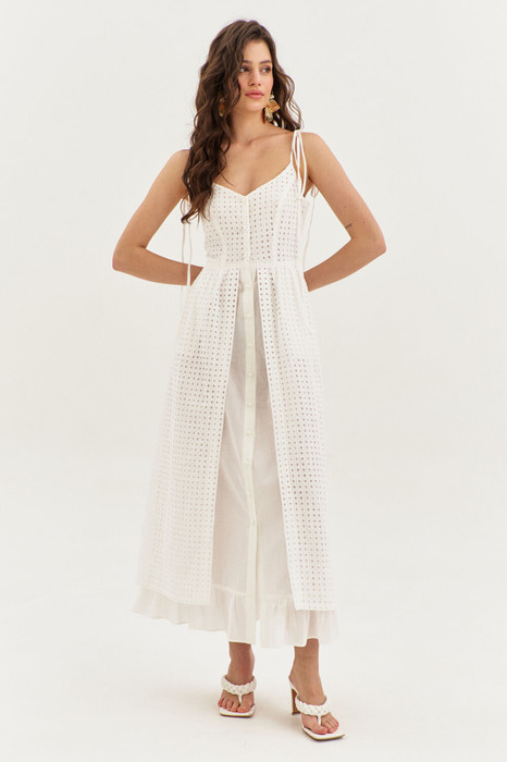 Платье полуприлегающего силуэта, длиной до щиколотки. Платье отрезное по лини талии. Лиф переда с рельефами. Платье двойное, выполненное из двух видов ткани: верхняя ткань – шитье, нижняя – хлопок. Юбка платья со сборкой по шву притачивания к лифу. Нижняя юбка с притачным воланом по низу. В боковых швах обработаны карманы. Застежка по переду на петли и пуговицы. Платье на завязывающихся бретелях.