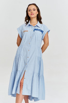 Платье полуприлегающего силуэта, выполненное на запах, длиной до середины бедра. Платье отрезное по линии талии. Лиф спинки со средним швом и рельефами. Лиф переда с рельефами от пройм до подреза по талии. Юбка спинки со средним швом и талиевыми вытачками. Юбка переда ассиметричная: правый перед укорочен, левый перед удлинен. Воротник пиджачного типа. Рукава двушовные, втачные, длинные. Застежка по переду на петли и пуговицы. Платье на подкладке с плечевыми накладками.
