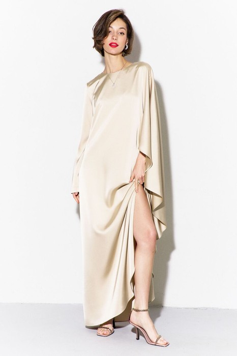 -платье ассиметричное: с левой стороны рукав цельнокроеный «летучая мышь», с правой стороны – втачной, длинный рукав