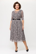 Платье женское для повседневной носки. Платье женское прямого силуэта, длиной за колено, с фигурным низом "ступенька". Перед с двумя нагрудными вытачками. Спинка цельнокроеная. Боковые швы с фигурными разрезами. Разрезы и низ платья с приточными планками из отделочной ткани. Горловина круглая с втачной стойкой. Платье со спущенным плечом. Рукав втачной, длиной 7/8, с приточной вертикальной планкой из отделочной ткани по центру и приточной манжетой из отделочной ткани. Платье без плечевых накладок. Длина рукава от горловины 60 см, длина спинки 103 см.