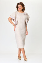 Платье для повседневной носки. Платье женское расширенное к низу, длиной за колено. Перед с 2-мя нагрудными вытачками с фигурным подрезом о линии талии до линии бёдер, в швах соединения подрезов обработаны карманы, собранные на эластичную тесьму. Перед с 2-мя приточными вертикальными планками по центру. Спинка с горизонтальным подрезом на уровне линии бёдер, верхний срез нижней части подреза со сборкой. Горловина круглая с втачной стойкой. Застёжка центральная на 5-тьобмётанных петель и 5-тьприштыных пуговиц. Рукав втачной, 2-х шовный, короткий. Верхний шов рукава с разрезом, низ с приточной манжетой, переходящей в завязки. Платье с плечевыми накладками. Длина спинки 109 см, длина рукава 22 см.