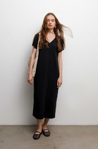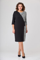 Платье женское предназначено для повседневной носки. Платье женское расширенное к низу, длиной до середины икры. Платье отрезное по линии талии. Верхняя часть переда с 2-мя нагрудными вытачками. Верхняя часть спинки цельнокроеная. Нижняя часть платья с лёгкой сборкой по верхнему срезу, с притачным воланом с лёгкой сборкой по верхнему срезу. Платье с карманами в боковых швах. Горловина с V-образным вырезом, обточная без воротника. Рукав втачной, двухшовный, длиной до локтя, с кулисой на верхнем шве. Платье с плечевыми накладками. Длина спинки 113 см, длина рукава 34 см.