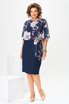 Платье женское, отрезное по линии талии, расширенное к низу, длиной до середины икры. Верхняя часть переда с 2-мя нагрудными выточками, отлётная, низ декорирован настрочным кружевом. Нижняя часть переда цельнокроеная. Верхняя часть спинки отлётная, низ декорирован надстрочным кружевом, нижняя - цельнокроеная. Горловина круглая, с втачной планкой из отделочной ткани по переду. Горловина с разрезом "капелькой" на спинке. Горловина и разрез обработаны косой бейкой, разрез фиксируется на 1-ну навесную петлю и 1-ну пришивную пуговицу. Рукав втачной, одно шовный, длиной 3/4 с притачным кружевом по низу. Платье на подкладке. Платье с плечевыми накладками.