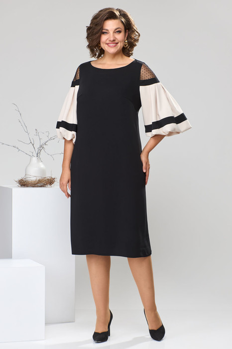 Платье женское относится к нарядной торжественной одежде. Платье женское полу прилегающего силуэта, длиной за колено. Перед с 2-мя нагрудными таллиевыми выточками и средним швом. Горловина обтачная, без воротника. Рукав втачной, длиной 3/4 из отделочной ткани, с 2-мя горизонтальными подрезами и 2-мя протяжными планками; верхняя часть рукава выполнена из сетки, средняя часть рукава по верхнему срезу с 2-мя боковыми и 2-мя односторонними складками, низ рукава собран на эластичную тесьму. Рукав на подкладке. Платье без плечевых накладок. Длина спинки платья 108 см, длина рукава 42 см.