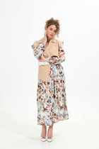 Платье женское отрезное по линии талии, расширенное к низу, длиной до середины икры. Верхняя часть переда с 2-мя нагрудными вытачками, нижняя цельнокроеная. Верхняя часть спинки с 2-мя таллиевыми вытачками, с обтачным разрезом по центру, фиксирующимся по горловине на 1-ну навесную петлю и 1-ну пришивную пуговицу; нижняя часть с 2-мя таллиевыми вытачками. Горловина круглая обточная, без воротника. Застёжка на потайную тесьму-молнию в левом боковом шве платья. Рукав втачной, одно шовный, по окату с лёгкой сборкой, длиной 7/8, низ собран на эластичную тесьму. Платье на подкладке. Платье без плечевых накладок. К платью прилагается отдельный ремень. Длина спинки платья 120 см, длина рукава 56 см.