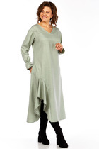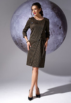 Платье женское отрезное по линии талии, расширенное к низу, длиной до середины икры. Верхняя часть переда с 2-мя нагрудными вытачками, нижняя цельнокроеная. Верхняя часть спинки с 2-мя таллиевыми вытачками, с обтачным разрезом по центру, фиксирующимся по горловине на 1-ну навесную петлю и 1-ну пришивную пуговицу; нижняя часть с 2-мя таллиевыми вытачками. Горловина круглая обточная, без воротника. Застёжка на потайную тесьму-молнию в левом боковом шве платья. Рукав втачной, одно шовный, по окату с лёгкой сборкой, длиной 7/8, низ собран на эластичную тесьму. Платье на подкладке. Платье без плечевых накладок. К платью прилагается отдельный ремень. Длина спинки платья 120 см, длина рукава 56 см.