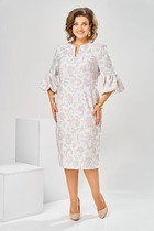 Платье женское относится к нарядной торжественной одежде. Платье женское отрезное по линии талии, расширенное к низу, длинное. Верхняя часть переда с 2-мя нагрудными вытачками, нижняя часть цельнокроеная. Верхняя часть спинки с 2-мя таллиевыми вытачками, с обработанным разрезом по головине, фиксирующимся на 1-ну навесную петлю и 1-ну пришивную пуговицу; нижняя часть спинки цельнокроеная. Горловина круглая, обточная, без воротника. Рукав втачной одно шовный, длинный. Рукав со сборкой по окату. Низ рукава собран на эластичную тесьму. Платье на подкладке. Платье без плечевых накладок. К платью прилагается съёмный пояс. Длина спинки платья 137 см, длина рукава 55 см.