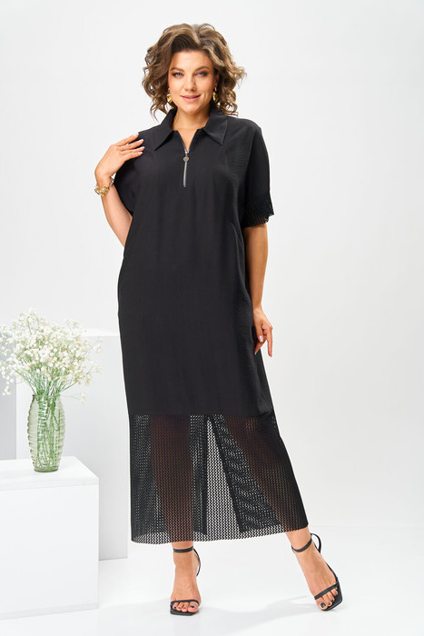 Платье женское предназначено для повседневной носки. Платье женское, прямого силуэта, длиной до нижней части икры. Перед с 2-мя фигурными рельефами, выходящими из плечевых швов, выходящими через центр груди и уходящими в боковые швы. Спинка с декоративной V-образной вставкой, из отделочной ткани, спинка декорирована пришивной металлической пластиной. Горловина круглая с втачным воротником, с разрезом по переду с втачной молнией. В боковых швах обработаны карманы. Низ платья с притачной широкой планкой из отделочной ткани со средним швом по спинке, заканчивающимся разрезом. Рукав цельнокроеный, короткий с притачной манжетой из отделочной ткани. Платье без плечевых накладок. К платье прилагается съёмный пояс. Длина спинки платья 133 см, ширина рукава вверху 21 см.