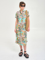 Платье женское, предназначено для повседневной носки. Платье женское, полу прилегающего силуэта, длиной за колено. Перед отрезной, ниже линии талии на 6 см; верхняя часть переда с 2-мя нагрудными выточками и средним швом, нижняя часть с отрезным бочком, шов соединения ею с передом, заканчивается шлицей, фиксирующейся на 3-и обмётанные петли и 3-и пришивные пуговицы; шов соединения часть переда декорирован 2-мя клапанами с закруглёнными концами закреплены на перед пришивными пуговицами. Спинка отрезная ниже линии талии на 6 см; верхняя часть с 2-мя таллиевыми вытачками и средним швом, нижняя часть с 2-мя таллиевыми выточками. Горловина с фигурным вырезом, обтачная без воротника. Платье со спущенным плечом. Рукам втачной, одно шовный, длиной за локоть. Платье без плечевых накладок. Длина спинки 105 см. Длина рукава+плечо 48 см.