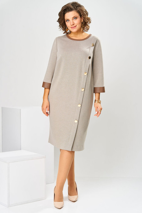 Платье предназначено для повседневной носки. Платье женское, полуприлегающего силуэта, длиной за колено. Перед с 2-мя нагрудными вытачками, с цельнокроенной вертикальной планкой шириной 3,5 см, закреплённой к переду 6-ю пришивными декоротивными пуговицами; перед с втачной планкой из лтделочной ткани. Спинка с 2-мя таллиевыми вытачками, с втачной металлической молнией, с втачной планкой из отделочной ткани по горловине. Платье с карманами в боковых швах. Рукав втачной, одношовный с притачной манжетой из отделочной ткани, рукав длиной 3/4. Платье с плечевыми накладками. Длина спинки платья 103,5 см, длина рукава 47 см.